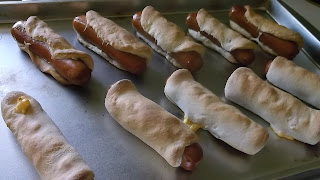 "Pigs-in-a-blanket" - hotdogs, strip of cheese, rolled into a flattened canned biscuit, baked.