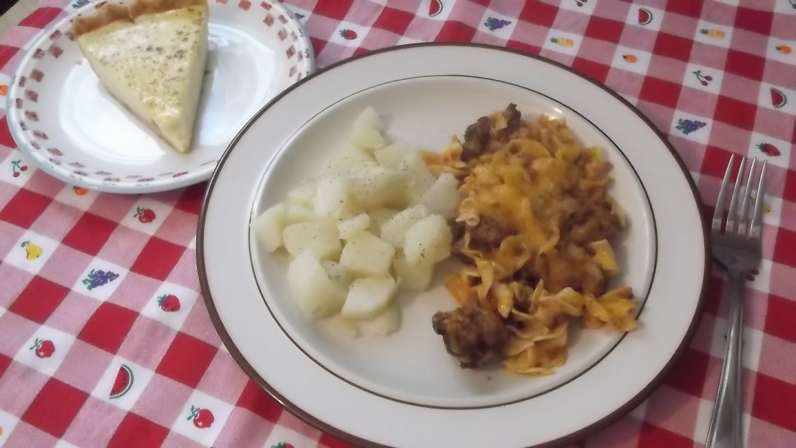 Hamburger-noodle casserole, boiled-buttered potatoes, custard pie.